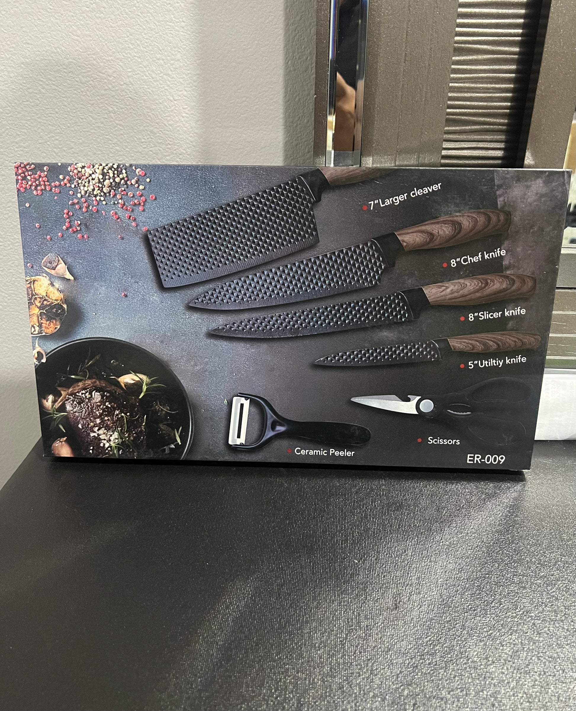 The Black 6-Piece Knife Set boasts superior high-carbon German stainless steel blades. These sharp, sturdy blades feature a thin edge, preventing food from sticking.